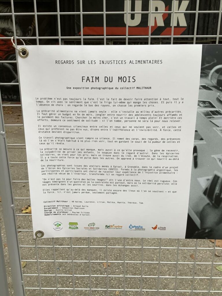 Pilotée par l’épicerie solidaire Episol, qui a été lauréate d’un appel à projets de l’UGESS, cette expo sur « les injustices alimentaires » est à découvrir ensuite du 4 novembre au 2 décembre à la bibliothèque Alliance dans le quartier Capuche de Grenoble.