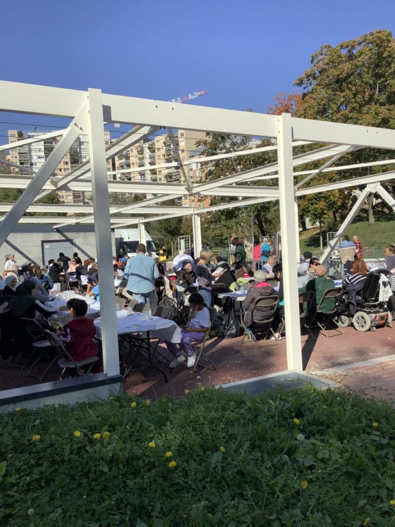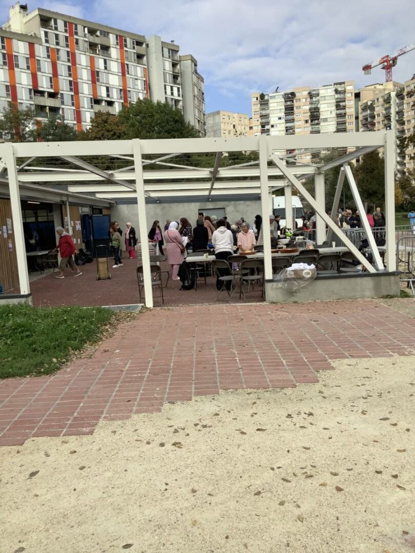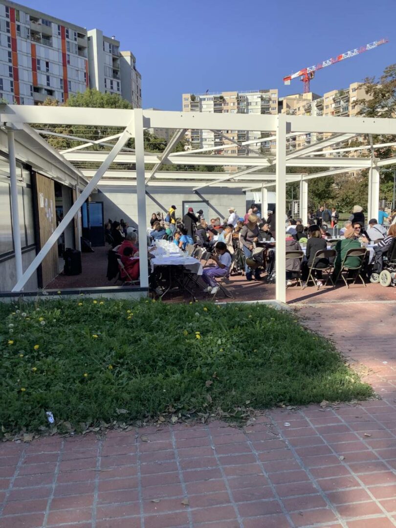 Samedi 18 octobre, un banquet a réuni à la Halle des Iris, dans le quartier de la Villeneuve de Grenoble, une centaine de convives. Coordonné par la Régie de quartier Villeneuve-VO-Vigny Musset, avec le soutien de la Ville de Grenoble, il a été préparé à partir de 10 heures par les habitant(e)s et des associations. C’était l’aboutissement d’un programme d’actions soutenu en 2025 par le Fonds FAST de la Métropole de Grenoble, pour l’accompagnement aux transitions écologiques : « l’alimentation dans tous les sens ».