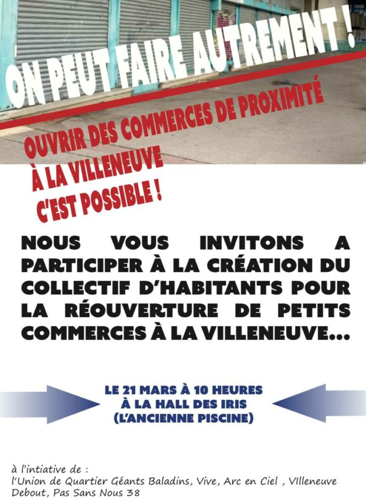 Depuis l’automne 2025, déterminés, des habitant.e.s ont décidé de passer à l’action afin de rouvrir des commerces. L’union de quartier de cette partie de la Villeneuve (l’Union de quartier Baladins-Géants) a d’abord réalisé une enquête, afin d’identifier le type de commerce à ouvrir en priorité, puis elle a commencé à organiser des réunions pour impliquer des associations du quartier et les habitant.e.s.