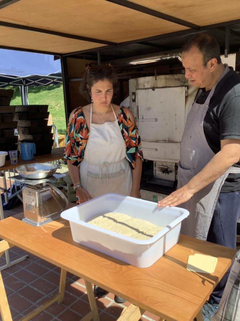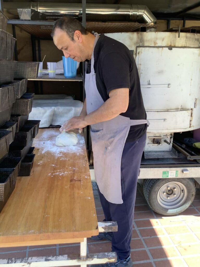 Étape façonnage des pains placés ensuite dans des moules rectangulaires (empilés sur la gauche des photos) :