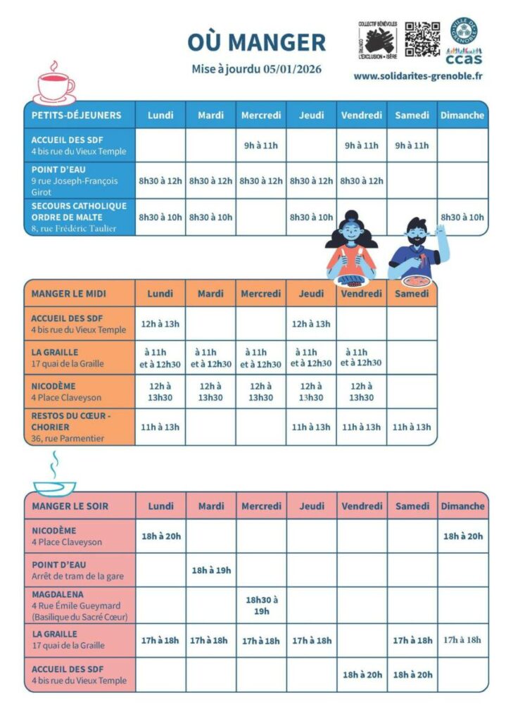 À Grenoble, il n’existe rien de semblable. Une personne en grande précarité doit se déplacer dans plusieurs lieux, très éloignés les uns des autres, pour pouvoir prendre un petit déjeuner et un repas chaud attablé à midi. Le soir, le nombre de lieux pour se restaurer est encore plus réduit et l’offre se limite souvent à une soupe.
