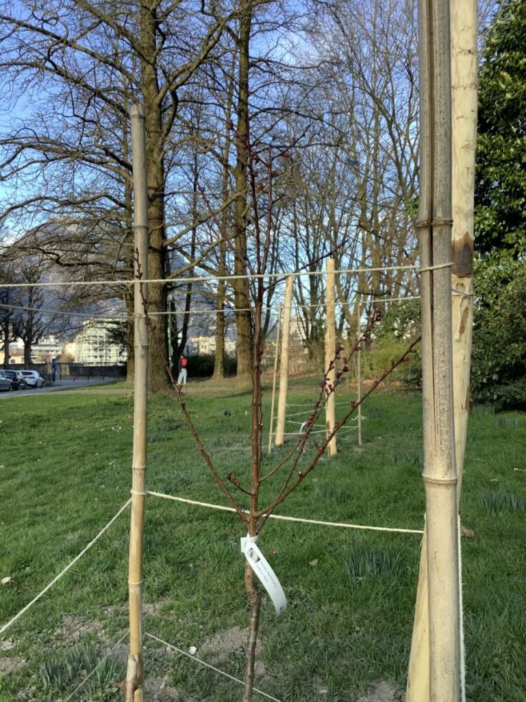 Les Citrus viennent d’une pépinière d’Alès ; les autres arbres Des racines et des fruits à Voreppe. Comme tous les plants d’arbres fruitiers à noyau et à pépins cultivés depuis plusieurs millénaires, il s’agit de bout d’arbres (les greffons) greffés sur des porte-greffes choisis en fonction du terrain, du climat et de la taille de l’arbre souhaité. Le porte-greffe peut être d’une variété différente du celle du greffon. Par exemple, l’un des deux abricotiers plantés, un Rosé de Provence, est greffé sur un tronc de pêcher (variété Rubira). Cela permet d’obtenir plus rapidement des fruits, en quelques années, au lieu d’attendre dix ans.