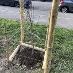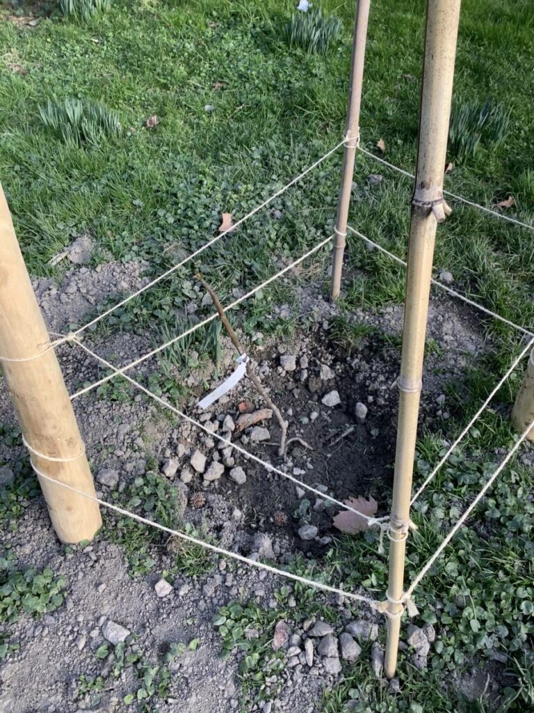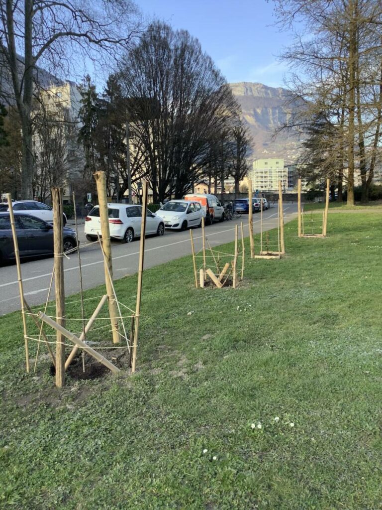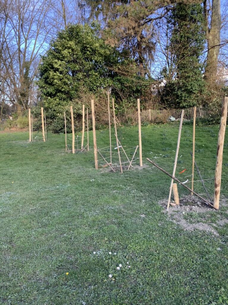 Les pieux et les ficelles ont pour but de protéger les arbres tant qu’ils n’auront pas bien pris racine et suffisamment grandi, notamment par rapport aux chiens. Quand vous passerez avec votre chien, tenez-le bien en laisse.