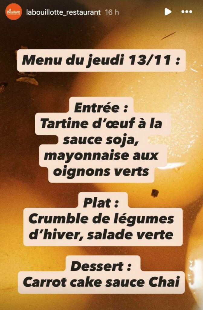 Si vous n’êtes pas follower des pages Facebook ou Instagram du restaurant, il suffit de cliquer dans la photo de profil (le rond) pour pouvoir accéder à Voir la story. C’est là que se trouve chaque jour le menu du déjeuner.