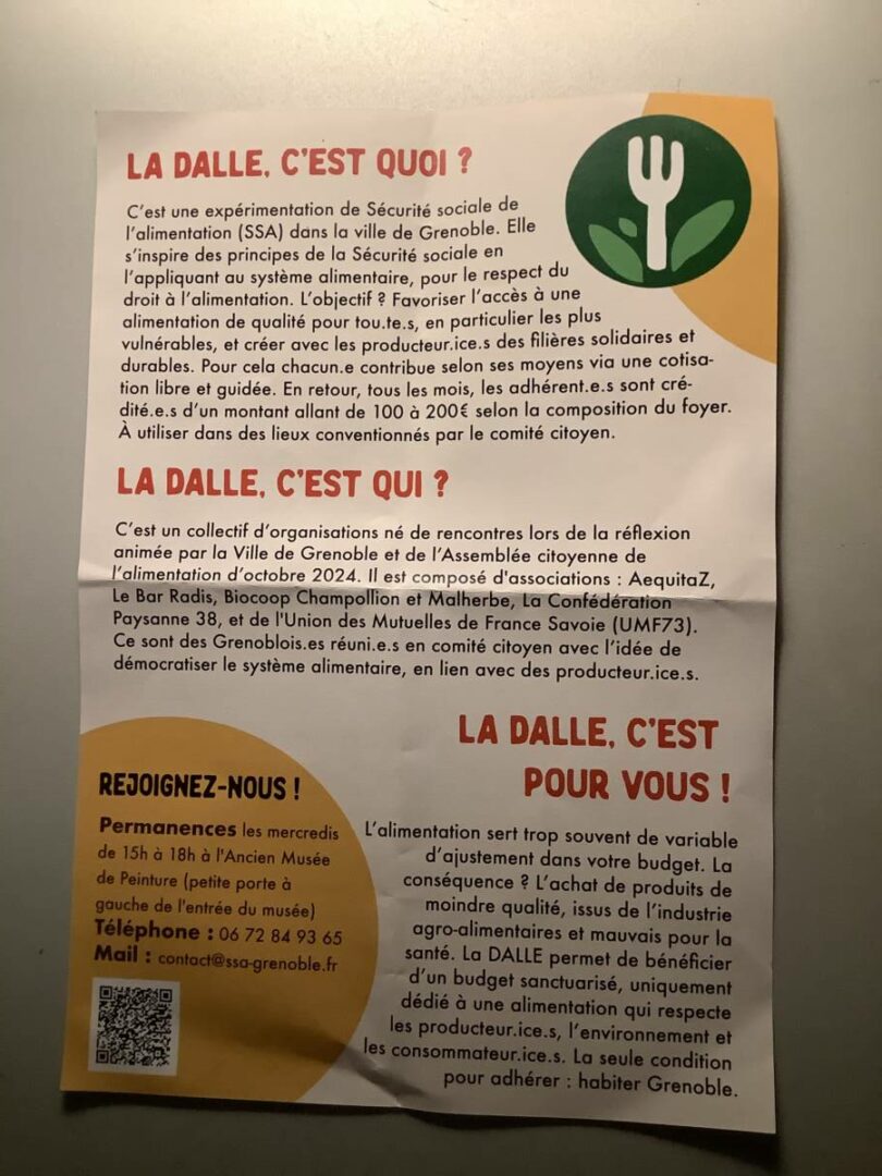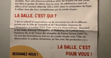 Les personnes présentes ont pu ensuite rencontré, dans des stands à l’intérieur, quatre organismes où les adhérents peuvent utiliser leur allocation de 100 à 200 euros : la coopérative Au Local, l’épicerie solidaire Episol, le restaurant associatif La Pirogue et le syndicat agricole La Confédération paysanne de l’Isère (deux fermes de ce syndicat co-gouvernent le projet : La Amapola et les Jardins du coteau).